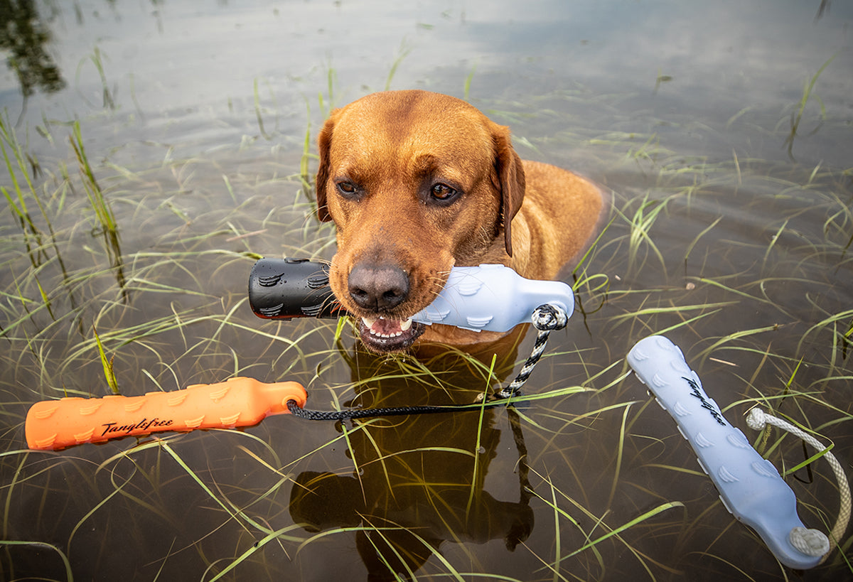 Can you ever have too many dog bumpers? According to dog training professionals, and your four-legged buddy riding shotgun, the short answer is honestly “No”. Six (6) different floating bumper options allow you to cover all training simulations and exercises needed to get your dog ready for the fall. The Three Feather Logo grips on the bumper help dogs maintain their soft bite. Tanglefree dog bumpers have the durability to provide you and your hunting partner with plenty of training activity in the off-season.