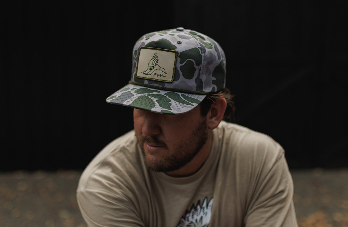 Marsh Duck Camo Hat with Pintail Patch brings true marsh-ready camouflage to long sits in the blind and quick run-ins at the water’s edge. It’s the trusted Richardson 256P silhouette—structured, five-panel, and built with a reinforced flip-up mesh stay and flat bill for field-straight style. The army olive rope adds a vintage flair, while the Pintail Patch signals your loyalty to the hunt. Wear it dawn to dusk—it's got your back when you're chasing limits or crafting stories.